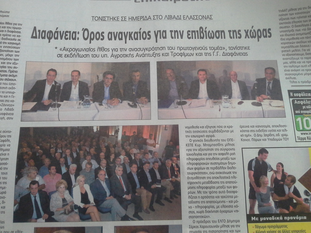 Με μεγάλη επιτυχία πραγματοποιήθηκε η ημερίδα «Διαφάνεια στην Πρωτογενή Παραγωγή, στην Εποχή της Κρίσης», που συνδιοργάνωσε το ΥπΑΑΤ με τη Γενική Γραμματεία Διαφάνειας και Ανθρωπίνων Δικαιωμάτων, σε συνεργασία με το Δήμο Ελασσόνας, στο Λιβάδι.